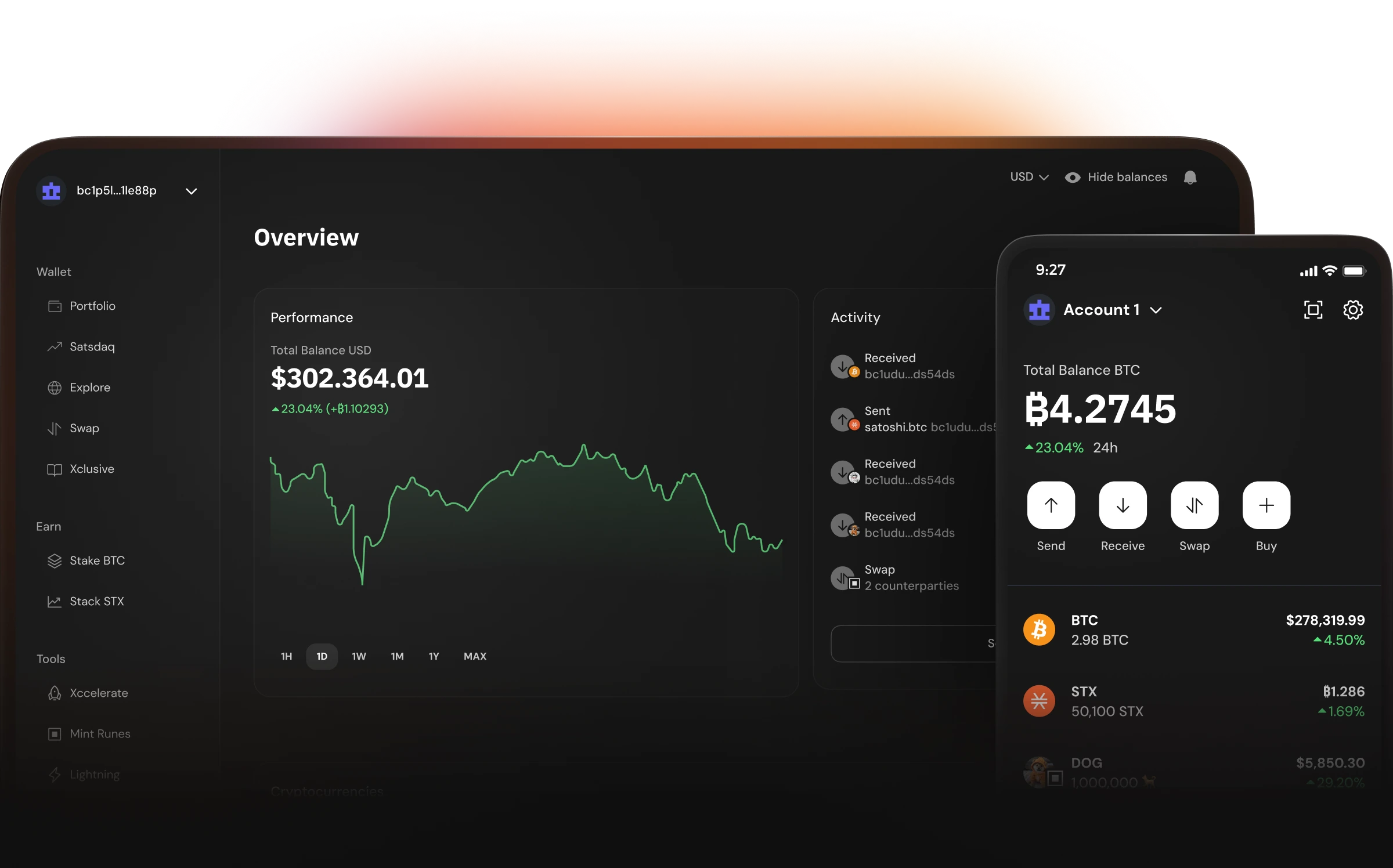 Stop switching apps. See your BTC, Ordinals and Runes alongside assets from Stacks, Starknet, Spark and more. Total clarity in one dashboard gives you total control.