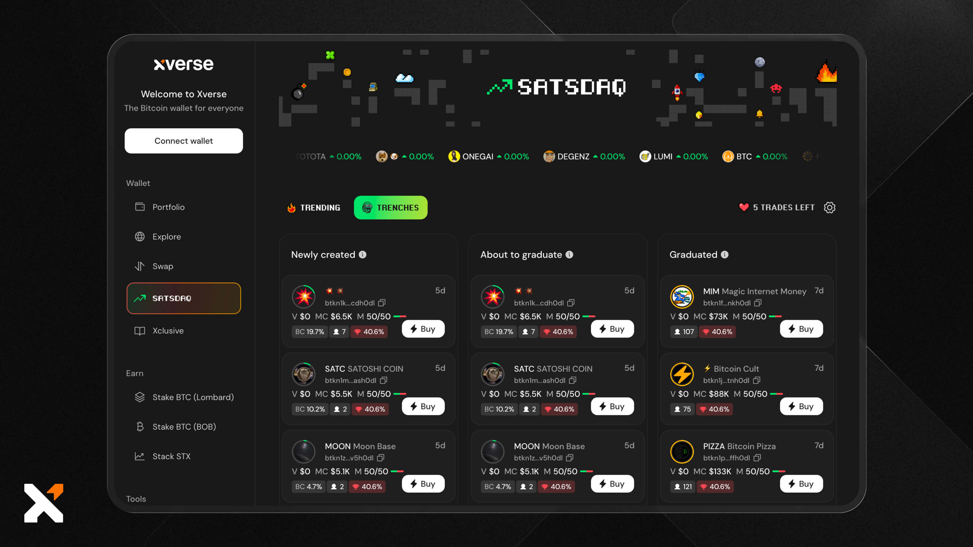You can trade instantly on the Satsdaq terminal using your Xverse Wallet. With security at its core, Xverse eliminates the need for QR codes or third-party wallets, giving you full control of your assets.