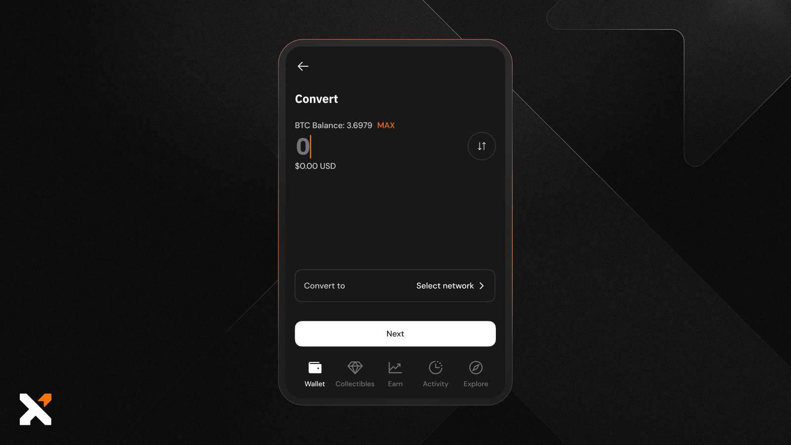 Select the Convert button in your Bitcoin dashboard to access the deposit feature for Spark.