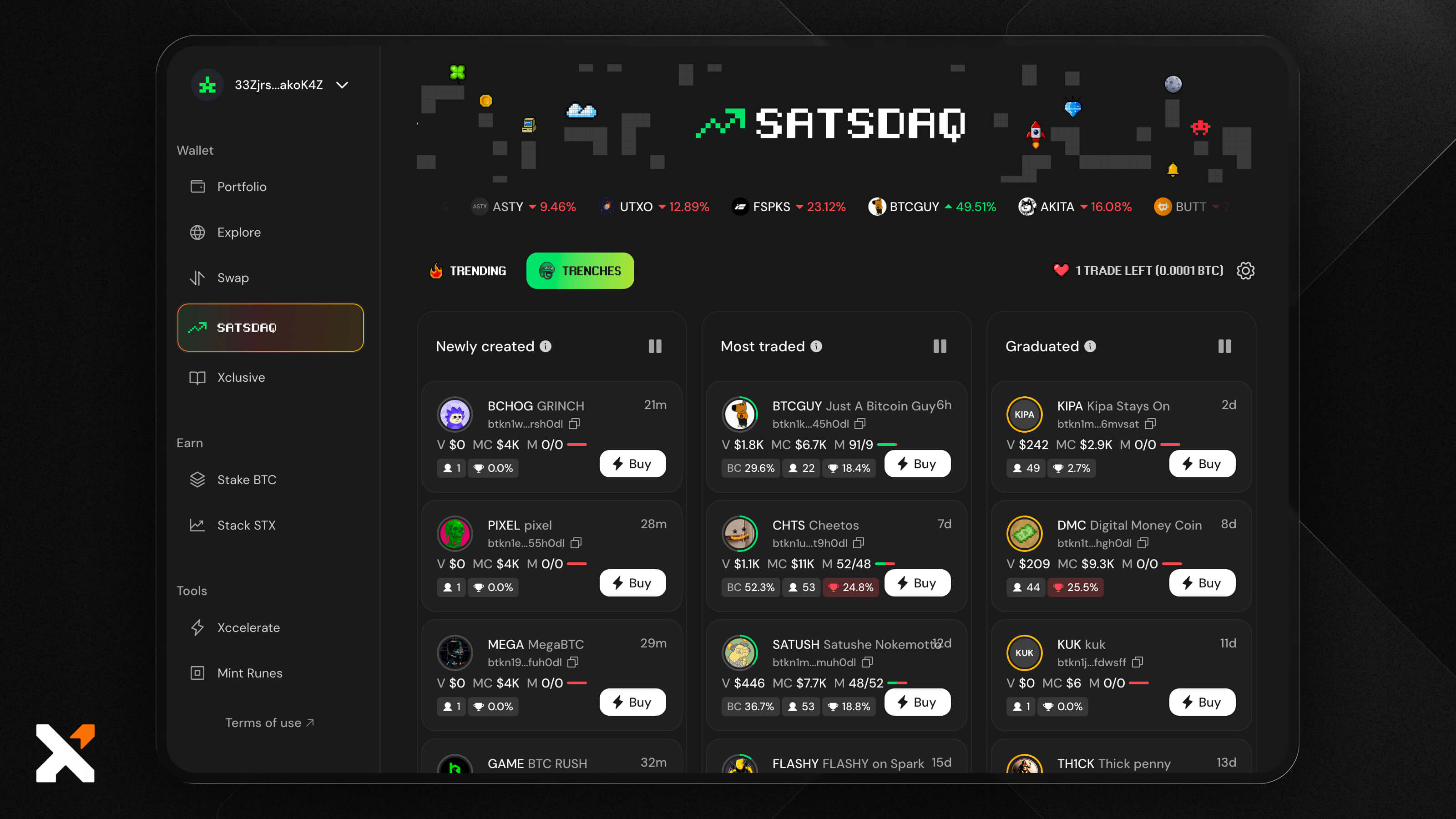 Additionally, Xverse has a discovery and trading platform called Satsdaq, where you can find both established and recently launched tokens. Use the Trending tab to find the most popular tokens at the moment, or Trenches for those that are newly launched and are still finding their feet.