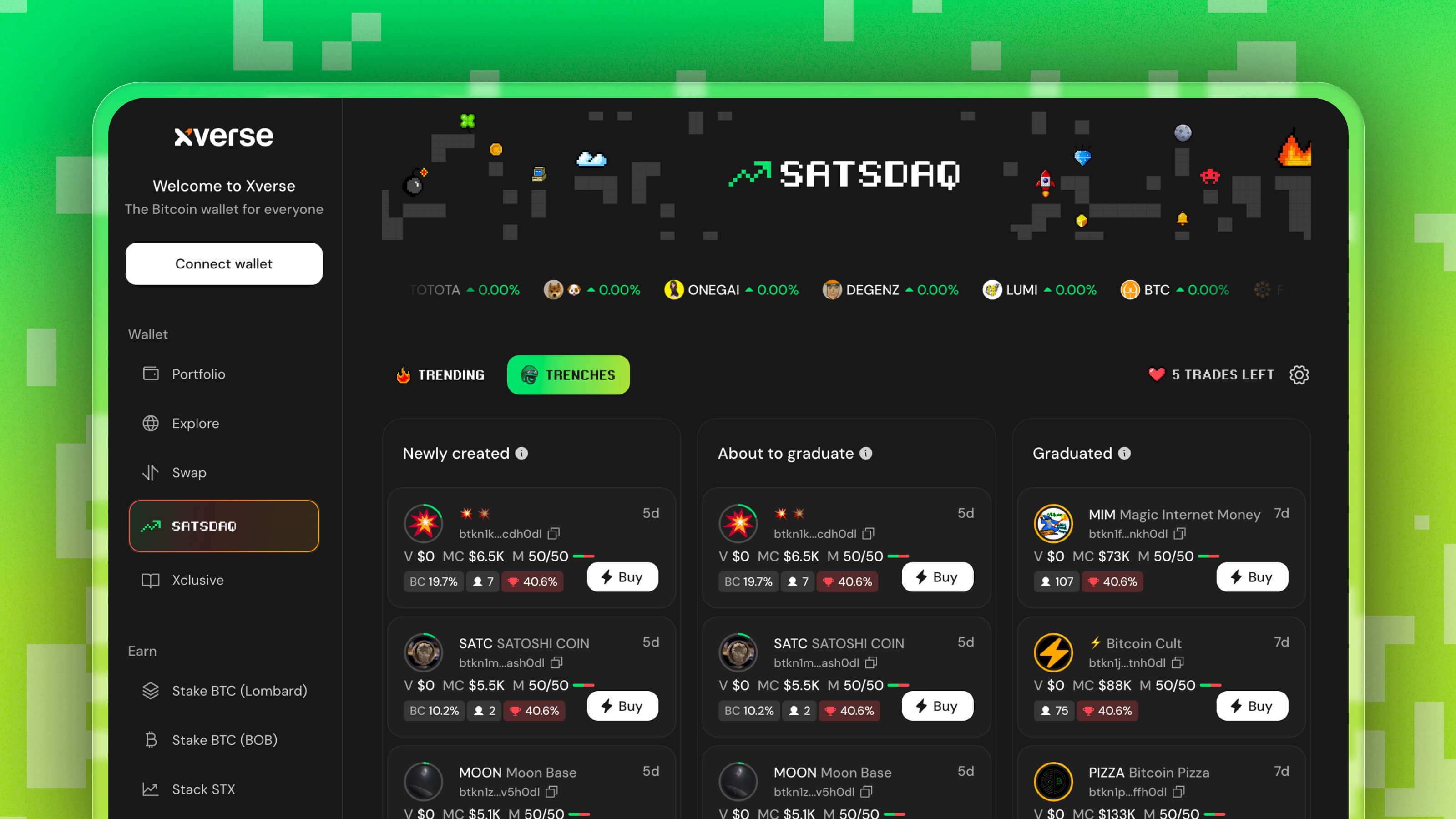Satsdaq is a new all-in-one discovery and trading terminal for Bitcoin-based assets located on the Xverse Portal.