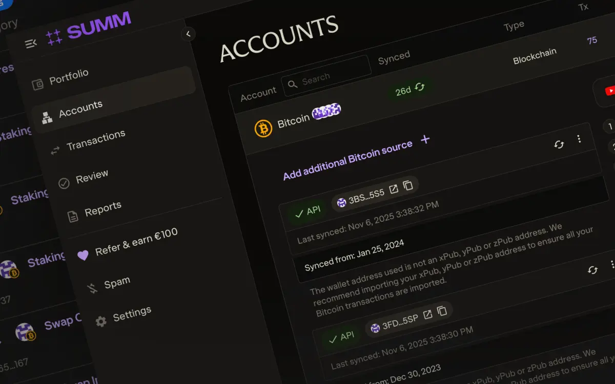 Get an overview of your Bitcoin taxes in minutes by connecting your Xverse wallet to Summ, which automatically imports all your transaction data and calculates your tax obligations based on your country’s regulations.