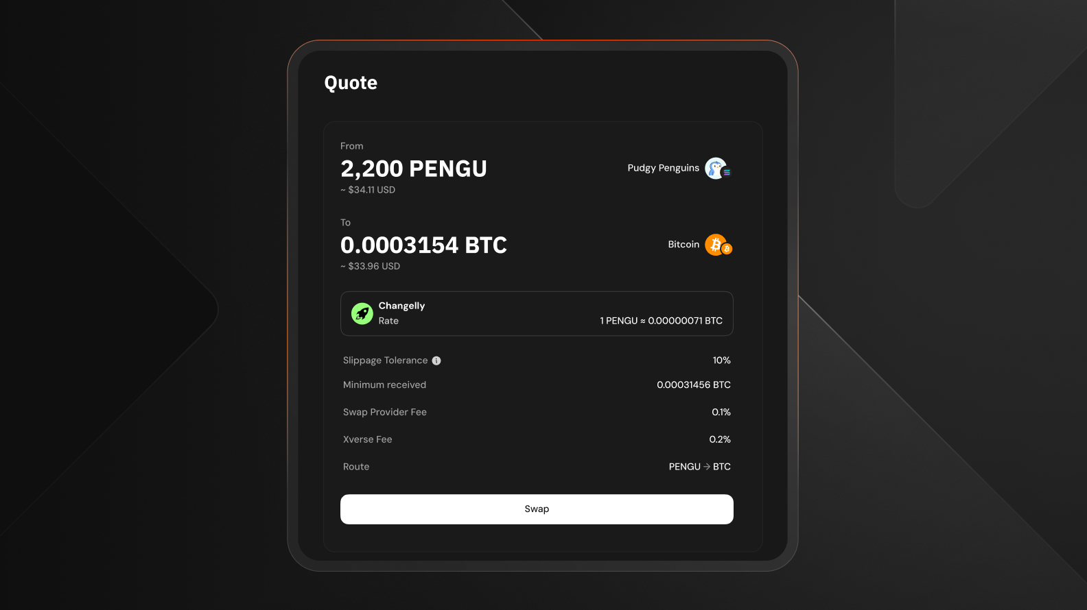 When using Xverse Swap to swap PENGU to BTC, there are no hidden fees, but standard network fees will apply. These details are presented transparently before you carry out any swap.